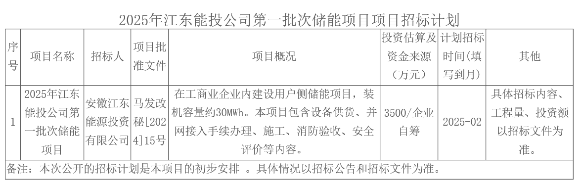 2025年江東能投公司第一批次儲能項目項目招標計劃