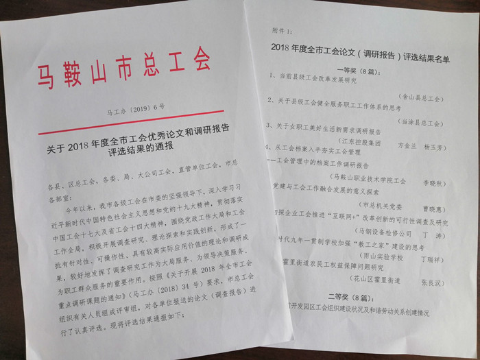 日前,馬鞍山市總工會下發(fā)了《關(guān)于2018 年度全市工會優(yōu)秀論文和調(diào)研報告評選結(jié)果的通報》,江東控股集團(tuán)工會選報楊玉芳執(zhí)筆撰寫的《關(guān)于女職工美好生活新需求調(diào)研報告》榮獲一等獎。