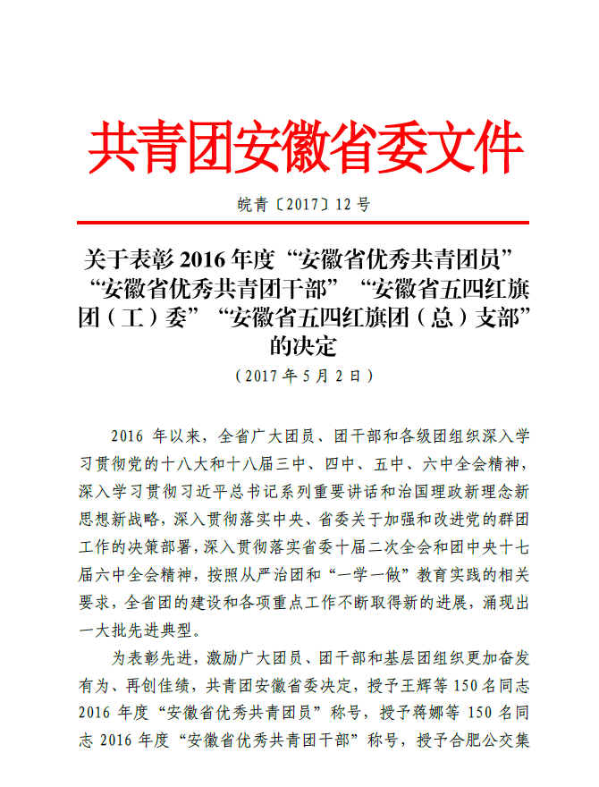 根據(jù)共青團(tuán)安徽省委員會(huì)〔2017〕12號(hào)文件精神,江東控股集團(tuán)團(tuán)工委下屬首創(chuàng)水務(wù)團(tuán)委書記繆蕓榮獲“2016年度安徽省五四優(yōu)秀團(tuán)干部榮譽(yù)稱號(hào)”。