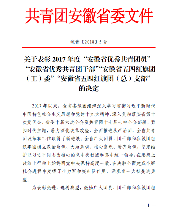 根據(jù)《關(guān)于表彰2017 年度“安徽省優(yōu)秀共青團員”“安徽省優(yōu)秀共青團干部”“安徽省五四紅旗團(工)委”“安徽省五四紅旗團(總)支部”的決定》皖青〔2018〕5號文件精神,集團團委下屬首創(chuàng)水務(wù)團員劉玉鳳獲2017年度省級優(yōu)秀共青團員榮譽稱號。