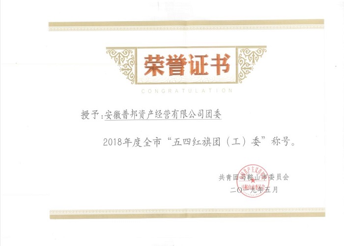 近日,共青團馬鞍山市委發(fā)布表彰決定,普邦資產(chǎn)公司團委獲2018年度全市“五四紅旗團(工)委”榮譽稱號。