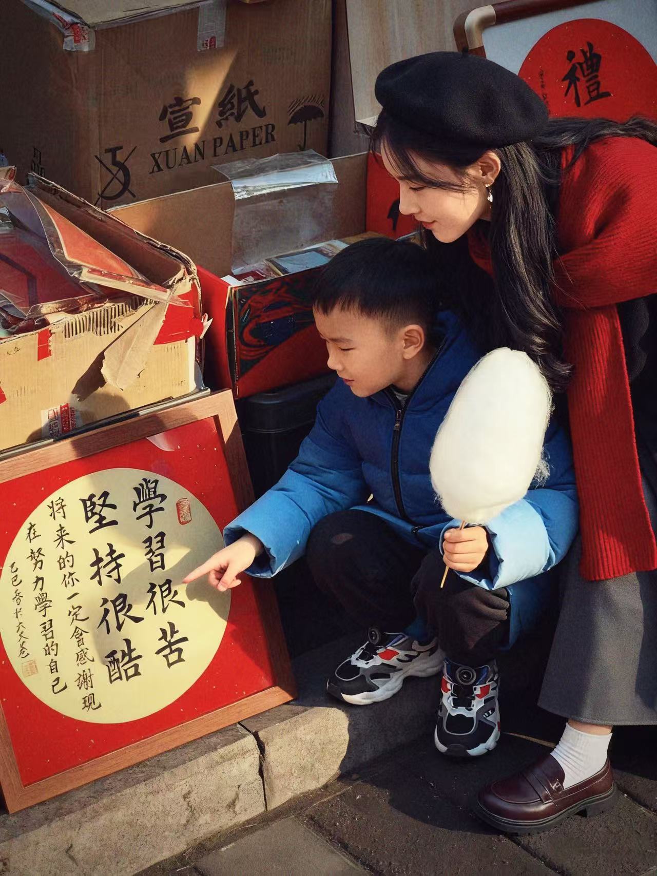 今年,我們一家人專程去了桐城六尺巷,巷口宣紙上寫著 “學(xué)習(xí)很苦,堅持很酷”。小侄子攥著剛買的棉花糖,跑到宣紙展示箱旁坐下,我蹲下身,指著牌子上的標(biāo)語問他:“你可知道這是用什么東西寫的?” 小家伙似懂非懂地點(diǎn)頭,指著身后裝宣紙的箱子說:“就是用這個箱子里的紙寫的!但是這個和我平時畫畫的紙有什么不同嗎?”,我耐心地回答他:“你看宣紙白白的,干干凈凈的,就像我們,要做清清白白的人?!毙≈蹲勇牶螅咽稚系陌咨藁ㄌ桥e得高高的:“就像剛做出的棉花糖,干干凈凈!” 這話讓一旁的父親也笑了,他摸了摸孩子的頭,輕聲說:“對,‘堅持清白’和‘堅持學(xué)習(xí)’都是最酷的事。”